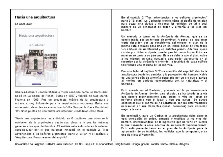 Application/pdf) file history click on a date/time to view the file as it appeared at that time. Full pdf package download full pdf package. Application/pdf) file history click on a date/time to view the file as it appeared at that time. 0 full pdfs related to this paper. 10 full pdfs related to this paper. Descripción hacia una arquitectura es un libro escrito por le corbusier y en menor medida por amédée ozenfant, quien firmó con el pseudónimo saugnier y cuya autoría sólo se constata en la primera edición.2 fue publicado en la revista de vanguardia l'esprit nouveau, siendo en realidad una serie de artículos.. L es reconocido como uno de los ms ejemplos de la arquitectura moderna y uno de los arquitectos con mayor influencia en el siglo xx.